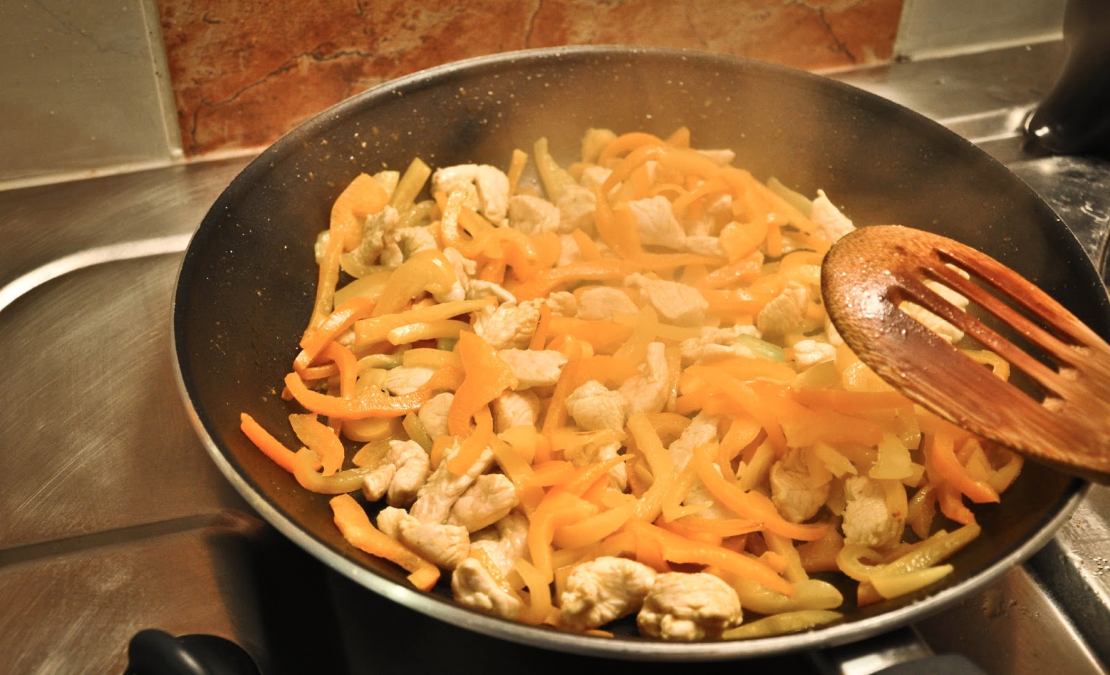 - Coupez vos escalopes de poulet en dés et ajoutez les dans la poêle. Laissez cuire encore 10/15 minutes.