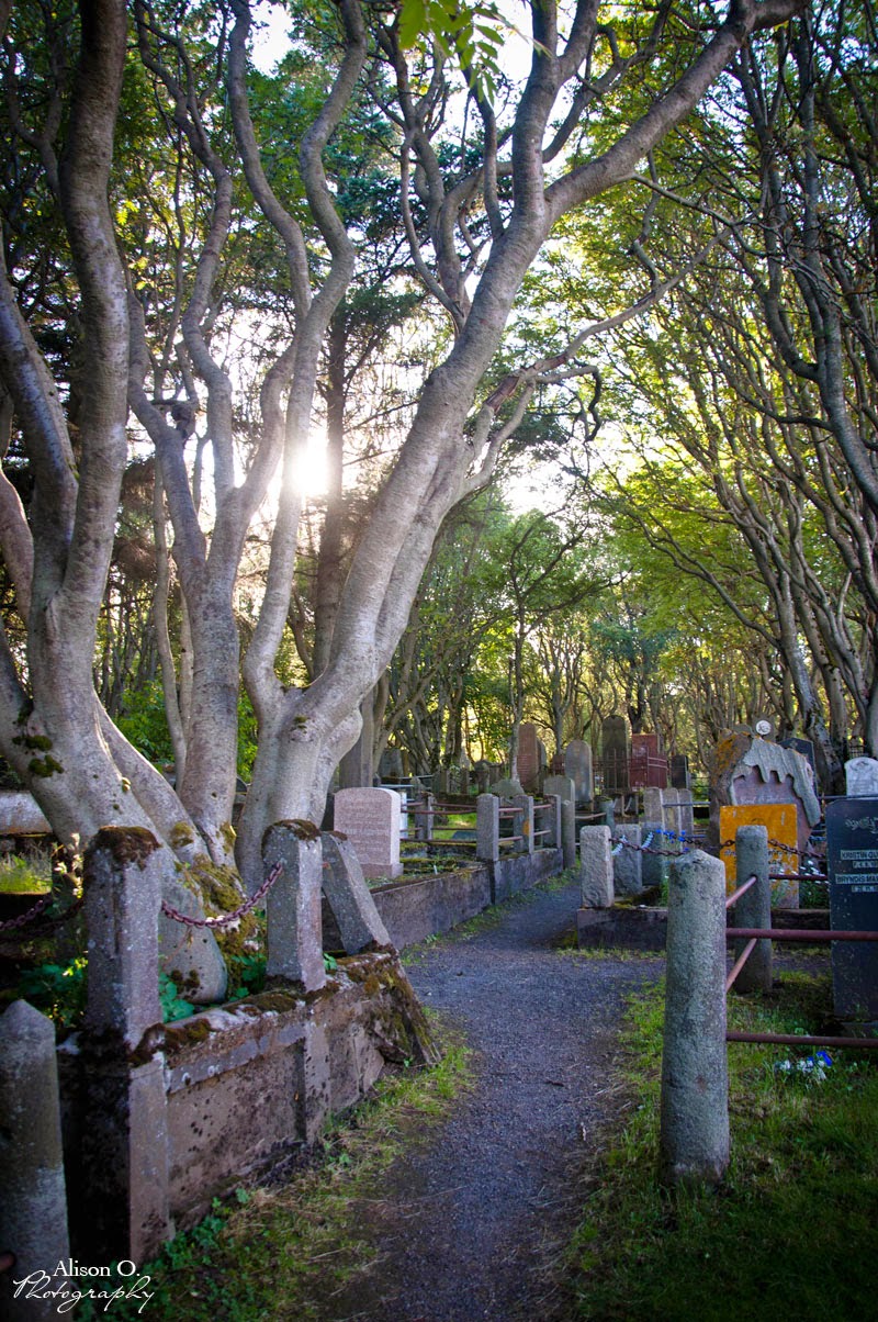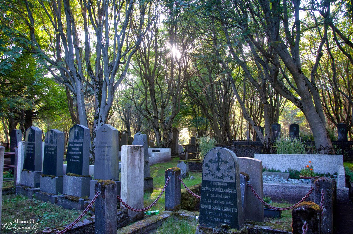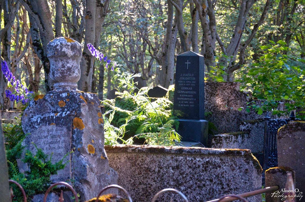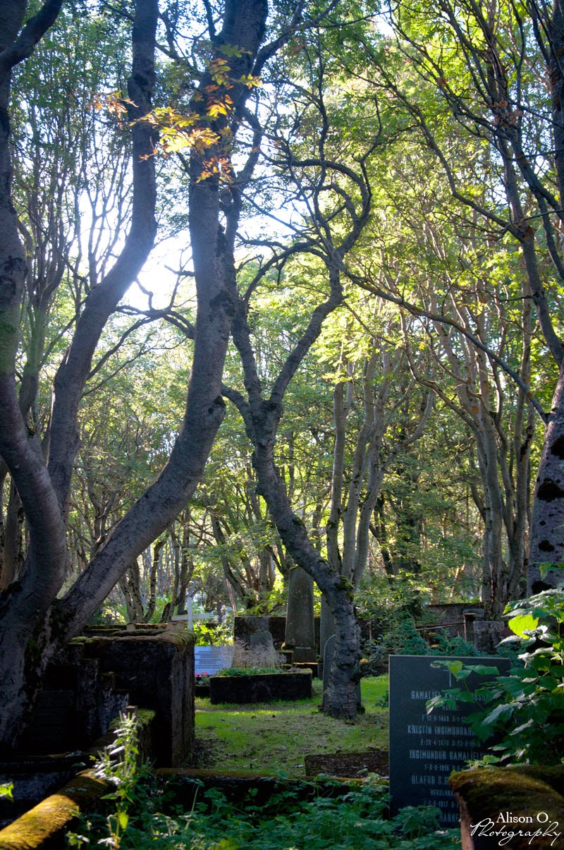 Après le port, et avant le repas du soir, direction le vieux cimetière Hólavallagarður. Alors vous allez me dire “Quelle idée de visiter un cimetière…” Eh bien celui de Reykjavik est assez particulier. Situé sur une colline, c’est un dédale d’arbres et de stèles dont les plus anciennes datent de 1838. 200 stèles y sont d’ailleurs classées monuments historiques. Je crois que c’est l’endroit que j’ai le plus apprécié dans la capitale avec une atmosphère assez magique.