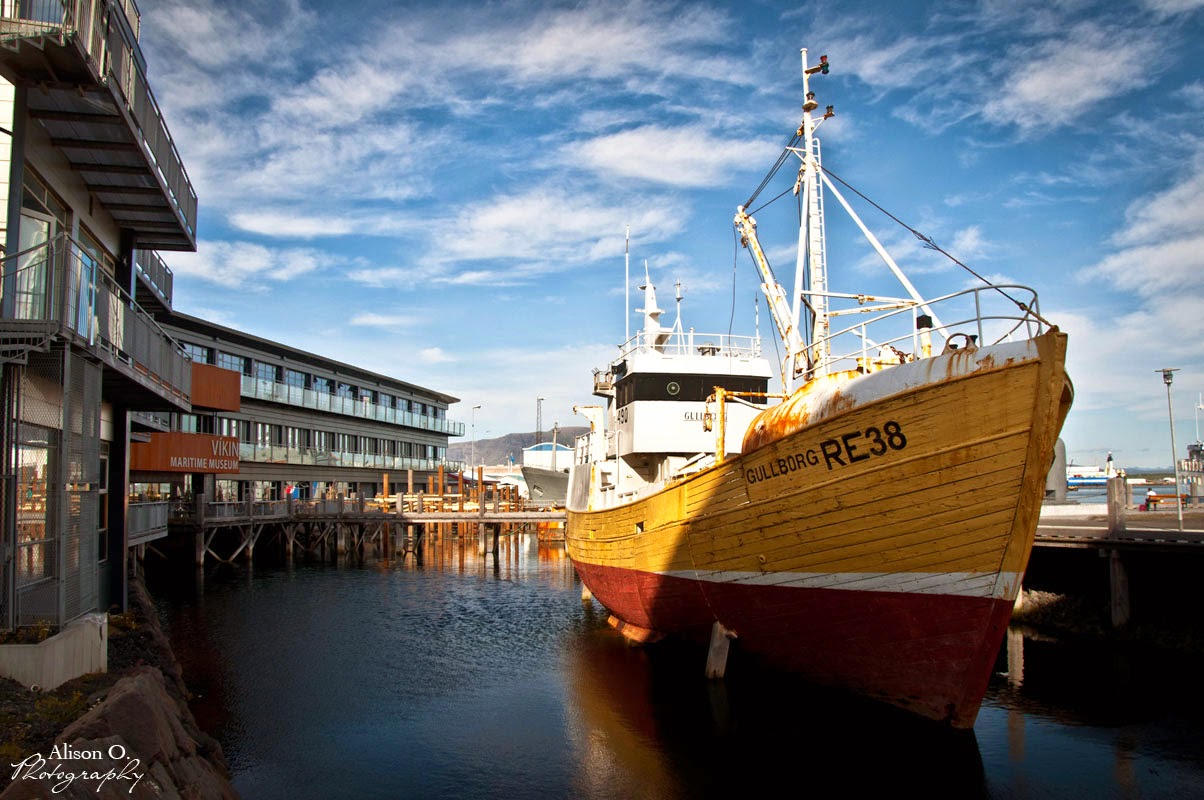 Et puisque pour ce musée nous sommes allés à l’autre bout de Reykjavik (oui perso ça m’a paru loiiiin ^^), on est revenu sur nos pas en passant par le vieux port avec un arrêt pour écrire quelques petites cartes. On a juste été dérangés par l’arrivée d’un grooos bateau sur le quai où nous nous étions posés loin des touristes. Vous y trouverez aussi la sculpture en hommage aux Coast guards du pays (et le seul train de l’ile… Une vieille loco avec 5m de rails, importée pour construire le port). Vous apercevrez aussi sur mes photos le Harpa, nouveau centre des congrès de la capitale.