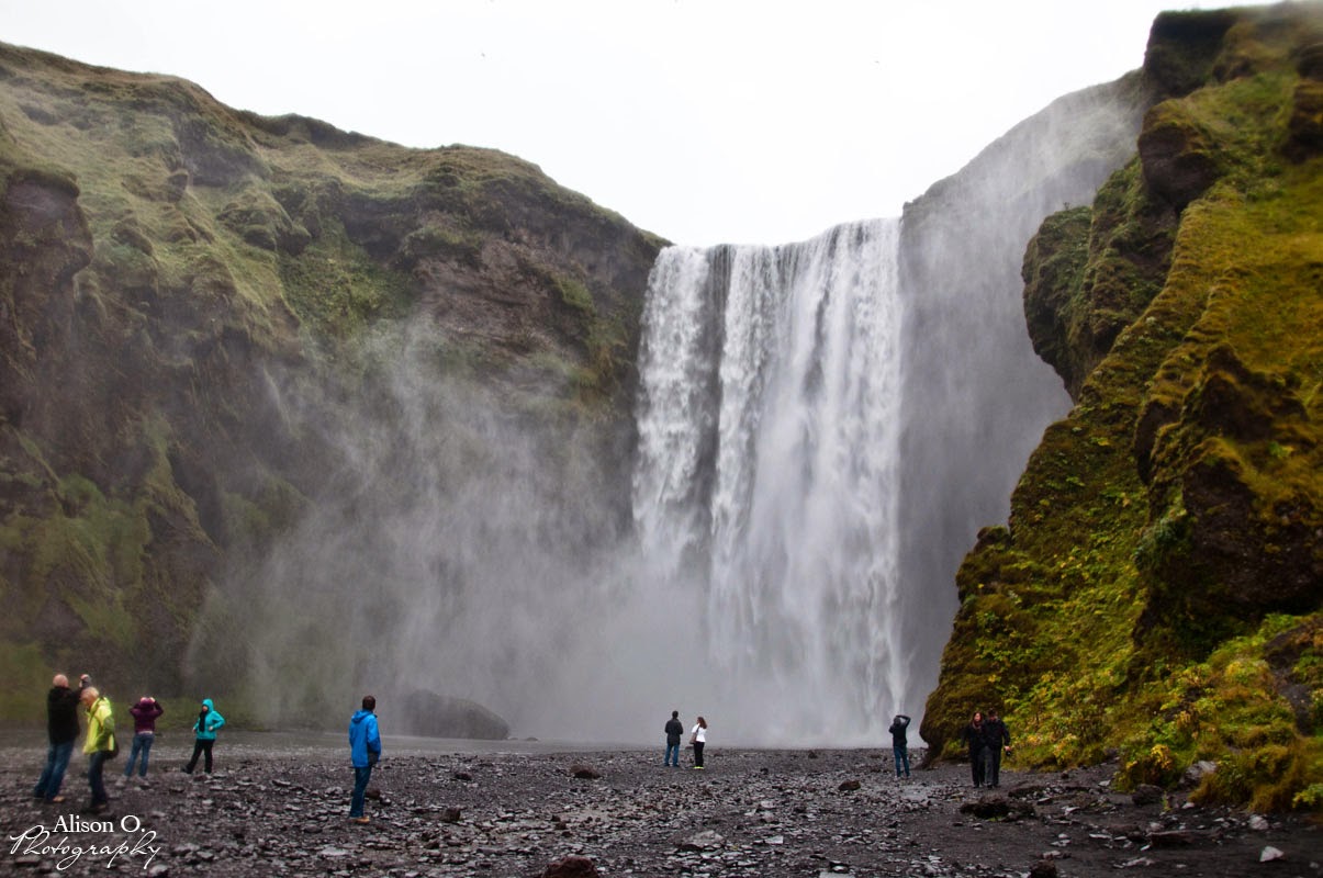 Nous voilà reparti pour rejoindre la cascade de Skógafoss (la cascade de Skógar… logique). Haute de 62 mètres, large de 25 mètres. Une immensité que l’on peu voir d’en haut (après avoir monté un escalier sans fin… Je n’ai d’ailleurs pas réussi à monter jusqu’en haut dans le temps imparti grrr), mais aussi d’en bas ! Double douche entre la cascade et la pluie ^^ Mais c’est superbe encore une fois 🙂