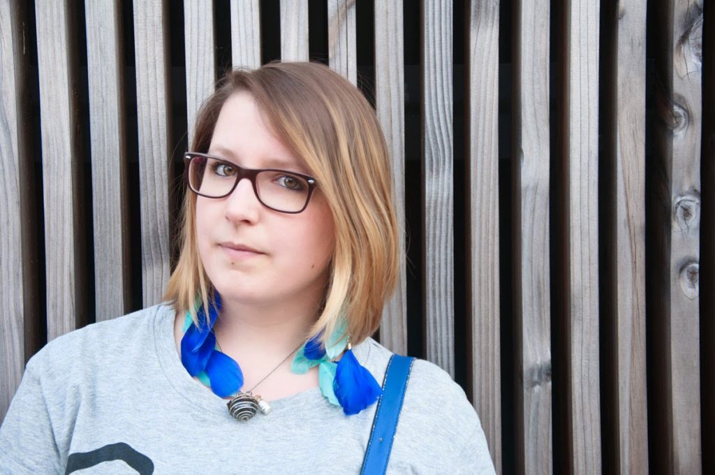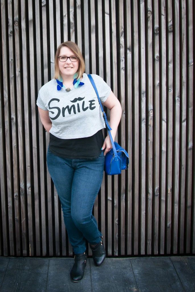 Pour ne pas montrer mon ventre (pour le premier défi j’avoue que je ne suis pas trop sortie de ma zone de confort…je suis encore un peu timide :$  déjà les photos ça fait beaucoup…), j’ai décidé d’associer mon crop top gris à un débardeur noir avec un jean slim. Très casual pour ce premier défi. Bon gris/noir/jean c’est pas ultra coloré, du coup j’ai accessoirisé tout ça avec mon sac fétiche : un petit cartable bleu électrique, des boucles d’oreilles plumes et un nailart tout d’un camaïeu de bleu ! Bref, trêve de blabla, voici donc le résultat ! Je remercier d’ailleurs mon Homme qui va s’y coller chaque mois ^^