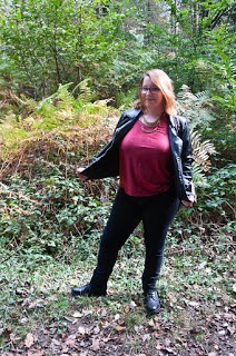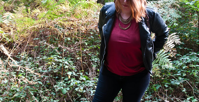 C’est là qu’on m’a perdue ^^ Je n’étais vraiment pas fan de cette matière et j’en avais une image pas très “moderne”, plutôt la matière des années 70’s vous voyez ? Bon… mais en voyant les inspiration des Fench curvettes, je me suis dit ” Et pourquoi pas si je trouve une pièce sympa ?”. Voilà la motivation revenue, je me suis mise en quête, dans les magasins, de LA pièce suédine que j’aimerai porter. J’ai eu des déception, des choses beaucoup trop serré ^^, des pièces superbes mais beaucoup trop cher et finalement… j’ai trouvé : un petit t-shirt en suédine bordeaux, loin de mes clichés de la suédine beige que je n’aime pas particulièrement. Pièce très simple certes, mais pièce quand même, je vous la présente donc aujourd’hui ! Du coup pour aller avec, j’ai choisi un jean slim noir, mon perfecto en faux cuir et des bottines noirs. Une touche d’accessoires et un sac de saison !