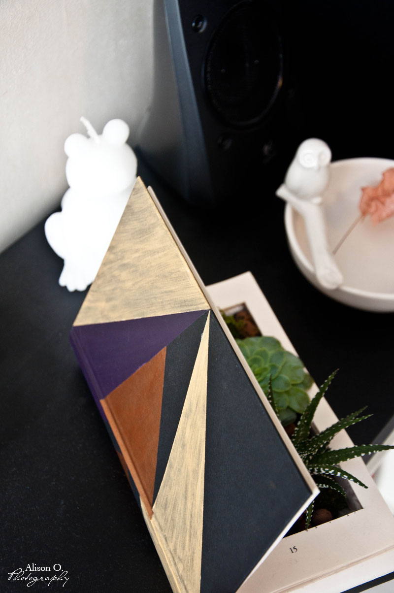1- J’ai choisi un livre dont la couverture était noire et neutre. J’ai donc commencé par la décorer. J’ai choisi mes peintures et j’ai réalisé des aplats triangulaires en or, bronze et violet sur la première de couverture et sur la tranche. Pour faire de beau triangles, j’ai utilisé du masking tape que je repositionnais suivant les formes voulues. Laissez ensuite sécher.