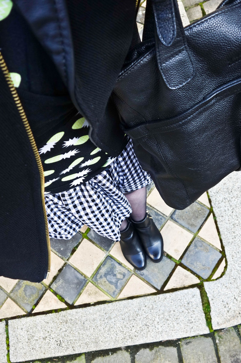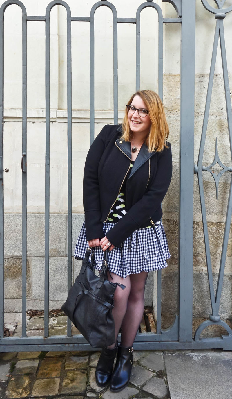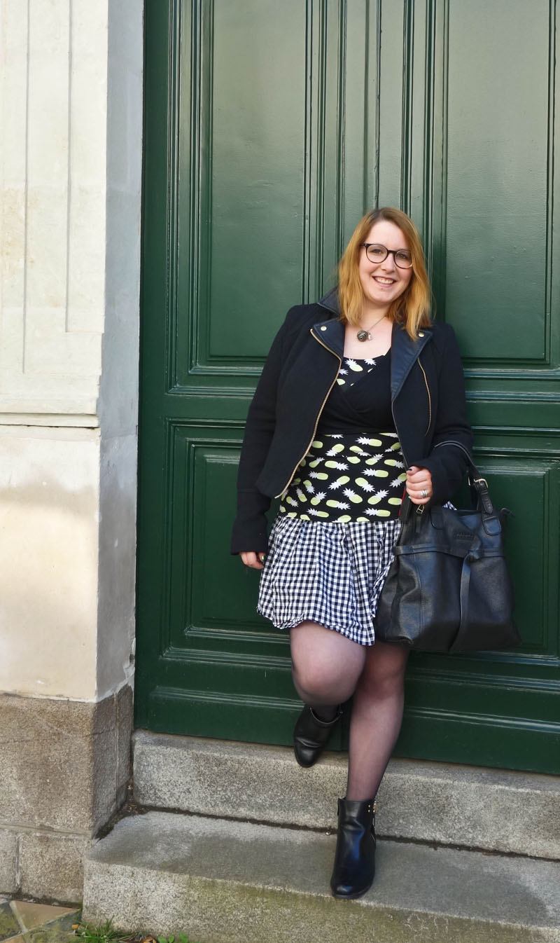 J’aime beaucoup l’association vichy/ananas un peu décalée et avec le reste ça fait très rock, alors j’adore ! Bon la jupe est un peu courte, le collant opaque aurait surement été mieux ^^ Pas grave J’assume mes jambonneaux !