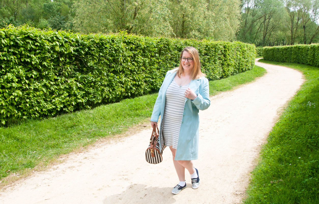 Alors j’ai décidé de porter une robe/tshirt marinière courte et moulante ! J’ai l’habitude de la mettre avec un jean, mais avec le beau temps qu’il a fait dernièrement fallait pas abuser. Alors j’ai sorti les gambettes.Avec cette robe, je porte un magnifique trench bleu pastel chiné dans un charity shop en Angleterre. J’adore l’intérieur de ce trench avec son motif vintage. Avec ça, un sac totalement dans le thème que j’ai assorti à mes petites chaussures pimpées paillettes que vous aviez découvert dans mon DIY. Et pour aller dans le thème “marinière”, un collier et un bracelet ancre 🙂