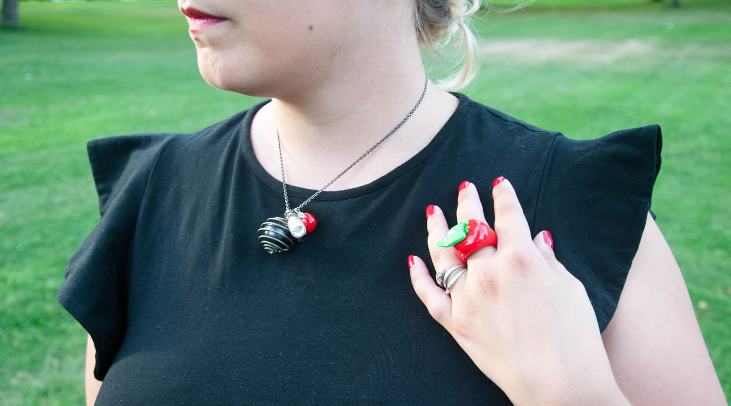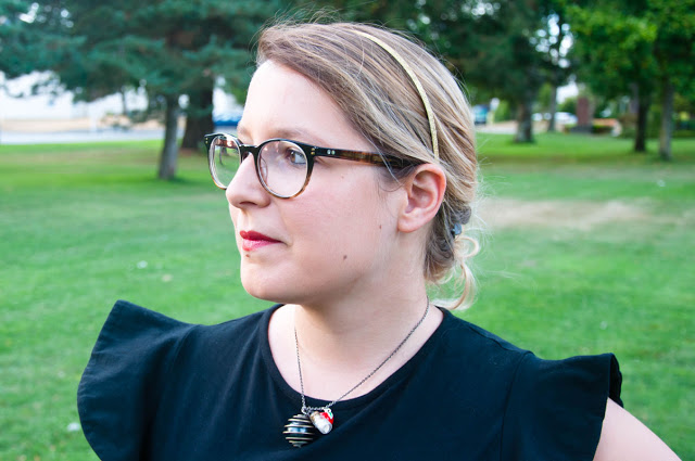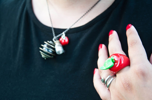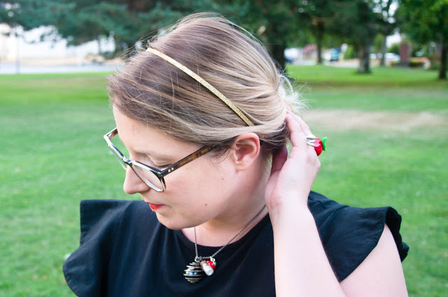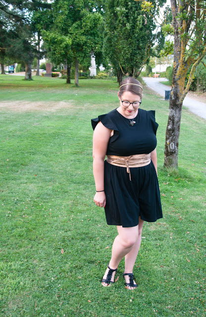 Je l’ai choisi car elle donne presque l’impression d’être une jupe avec le bas assez large. J’adore aussi ses épaules à volants qui fait la touche d’originalité de la pièce. Et l’avantage pour ce chaud mois de septembre, c’est court donc parfait pour une soirée 😀 J’ai décidé justement de jouer la carte “tenue de soirée” pour cette proposition en agrémentant la combi de plusieurs éléments couleur or : une ceinture pour bien marquer ma taille (en plus de l’élastique de la combi qui est caché 😉 ) et un serre-tête pailleté ; et rouge : une bague pomme trop choupi et un petit pendentif pomme également que j’ai rajouté à mon collier fétiche. Mes sandales noirs et hop, me voici prête !