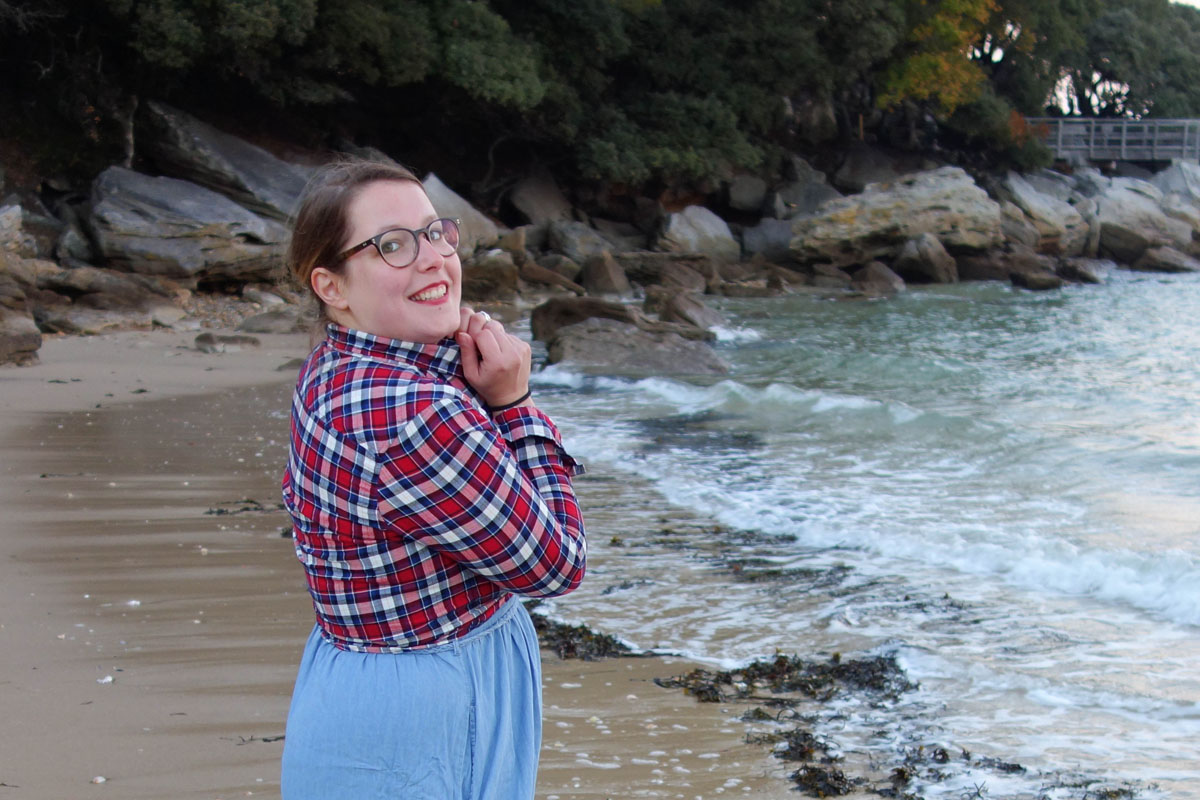 Alors voilà, ma proposition est simple, mais je l’aime tellement ! Je trouve qu’elle me correspond totalement : pratique, multi-saison, confortable. Pour ce défi “carreaux”, j’ai décidé d’assortir une robe bustier effet “jean”, avec une chemise à carreaux rouge, courte, que j’ai noué pour structurer le haut de ma tenue. Un bon collant opaque en ce mois de novembre et des Stan Smith aux détails rouges, parfaite pour cette balade en bord de mer. C’est une tenue que j’ai porté aussi sans collant cet été. Alors ce n’est pas un total look à carreaux, mais pour moi, la chemise apporte vraiment le détail cool à la robe qui est, elle, très simple.