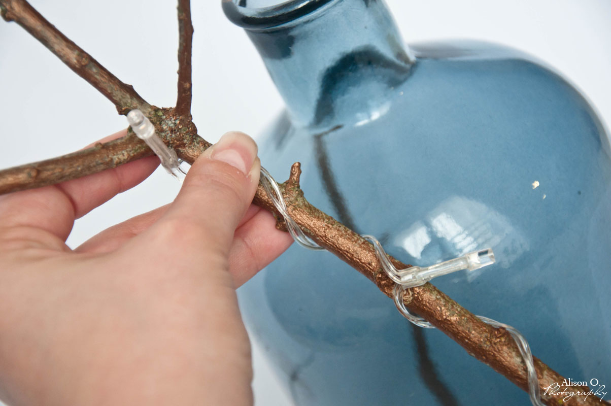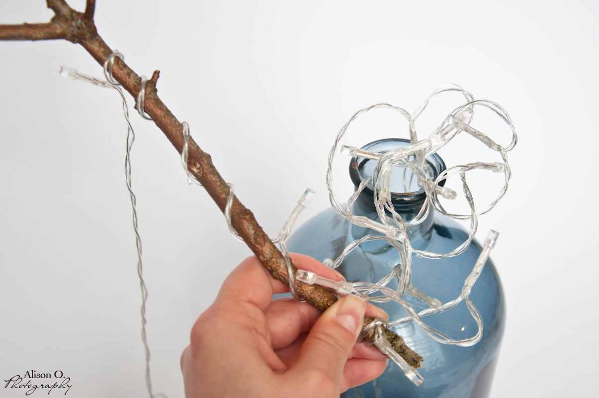 4- J’ai décidé d’utiliser une jarre en verre bleuté pour soutenir ma branche. Pour la personnaliser, j’ai ajouté une guirlande de led à piles en l”enroulant sur le bas de ma branche. J’ai mis le reste de la guirlande dans la jarre. Et c’est tout.