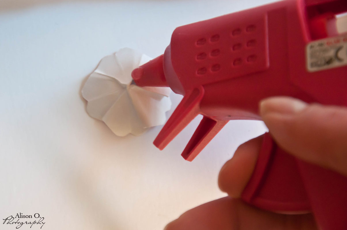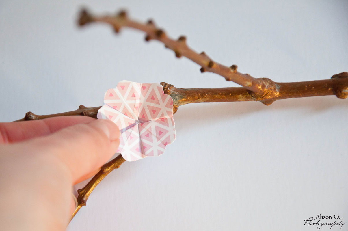 3- Vient le temps de la composition en collant vos fleurs sur votre branche. Faites des grappes de fleurs en mélangeant petits et grands origamis. Attention cependant, pensez bien que votre branche devra aussi accueillir vos bijoux !