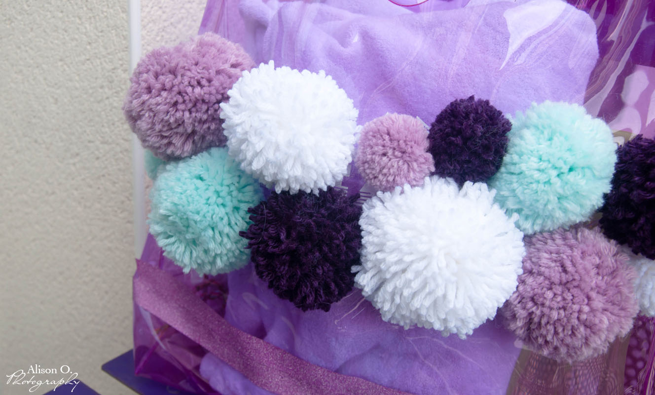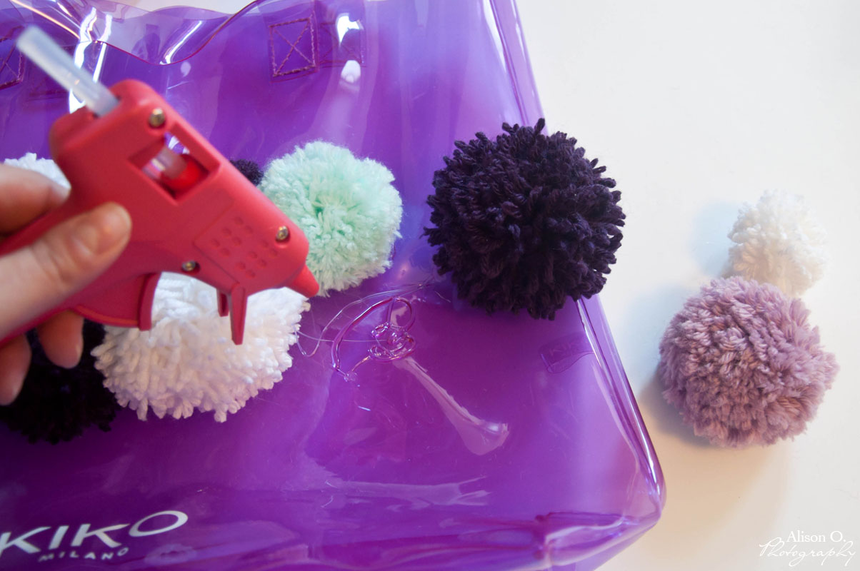 J’avais ce sac en plastic offert par Kiko et le message ne me plaisait pas forcément alors j’en ai profité pour le relooké avec des pompons tout doux dans les couleurs violet/turquoise/blanc qui se marient très joliment je trouve *-*
