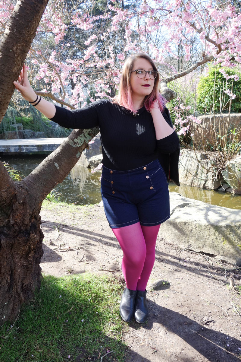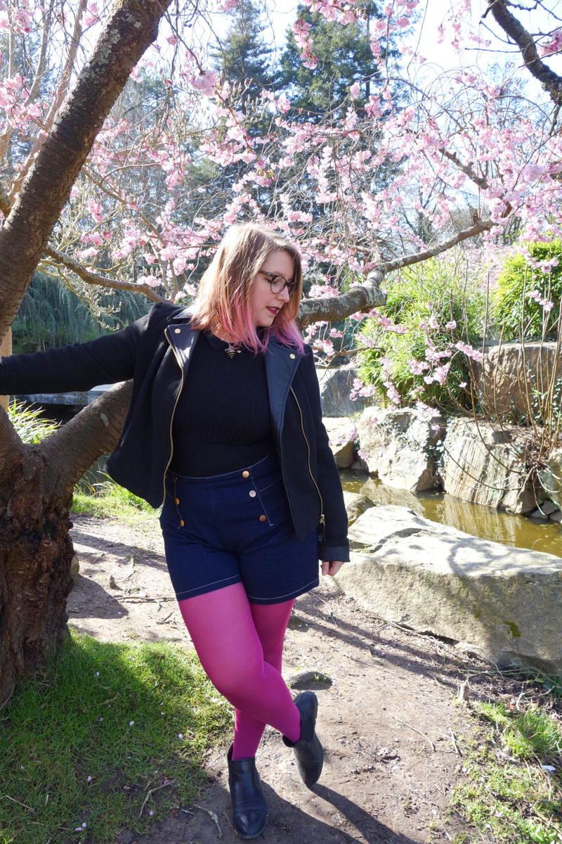 Je me lance donc sur ce look shooté avec mon chéri sur l’île de Versailles en mars dernier (oops), sous un magnifique cerisier en fleurs. Fleurs parfaitement assorties à la couleur rose que j’avais fait à mes cheveux pour un weekend et dont je vous parlais ici et ici. Pour cette balade, j’ai voulu allier praticité, originalité et du fun avec la couleur rose ! Je porte un haut moulant à petit col Claudine noir que j’ai assorti à mon nouveau short taille haute préféré de chez Castaluna. Ce short a d’ailleurs failli me passer sous le nez pendant les soldes 😛 (Mais il est encore dispo !!) Et pour faire un rappel avec mes cheveux, j’ai sorti ce superbe collant rose fushia ayant un liseré noir derrière. J’ai cru qu’il allait faire froid alors j’avais aussi une veste noire en laine et cuir et mes habituelles bottines noires si confort !