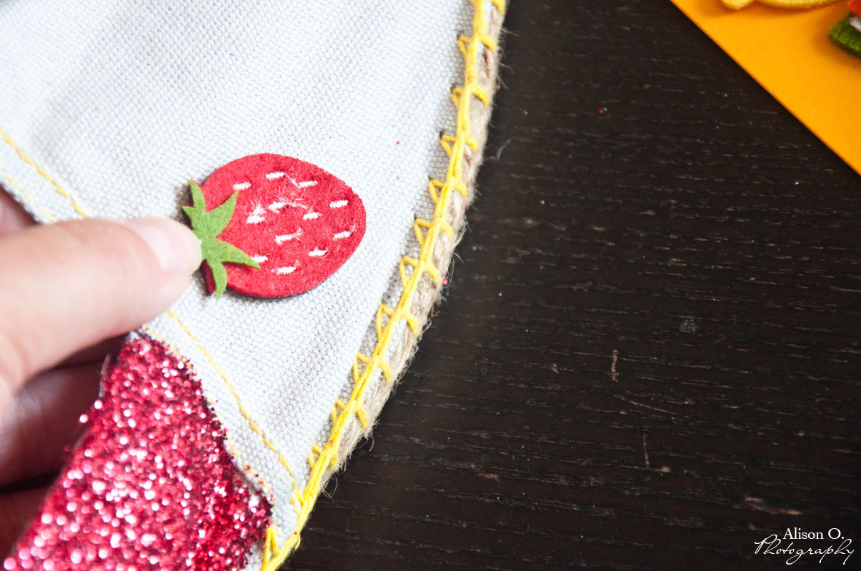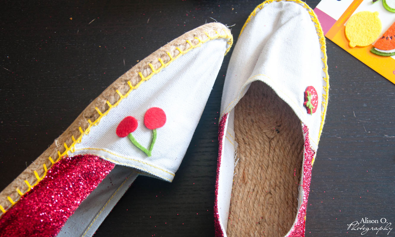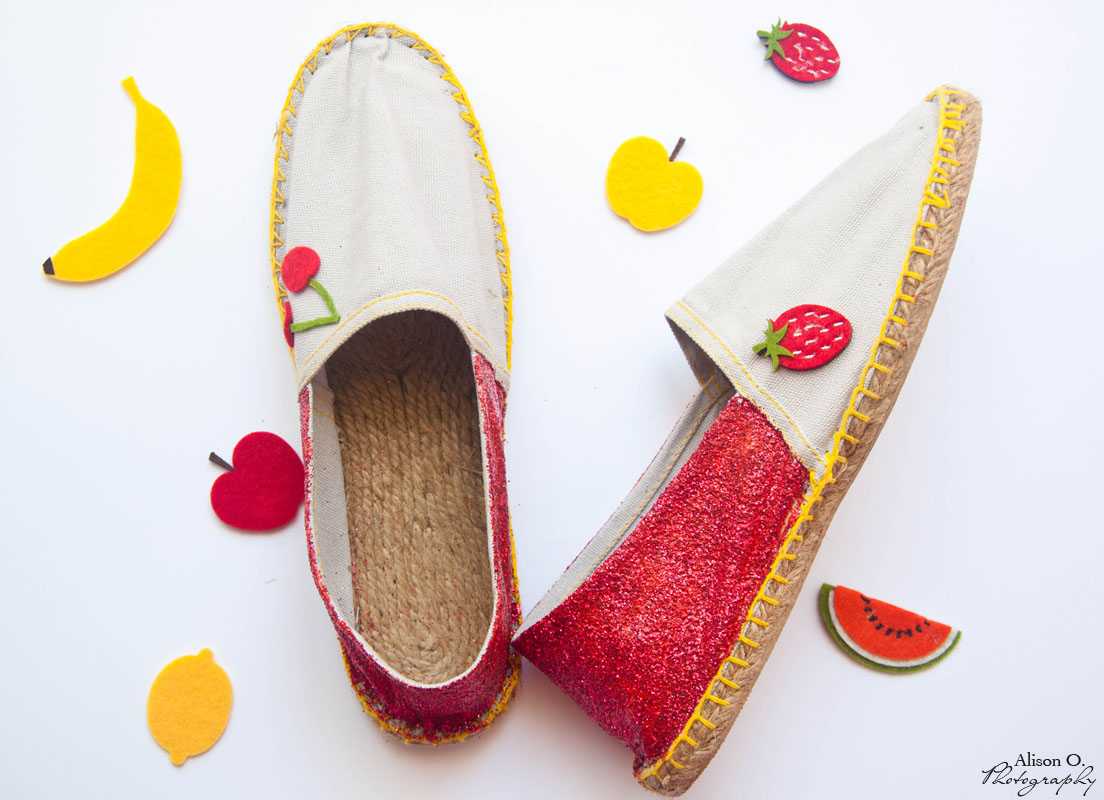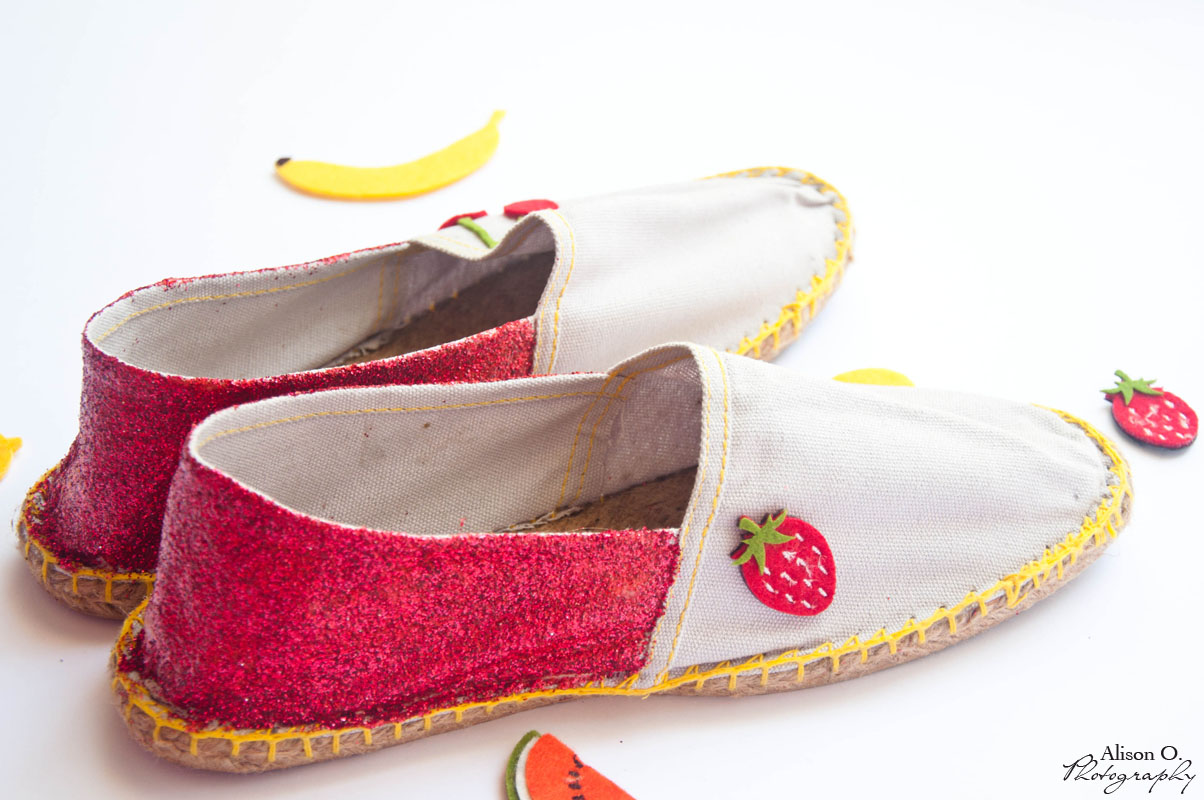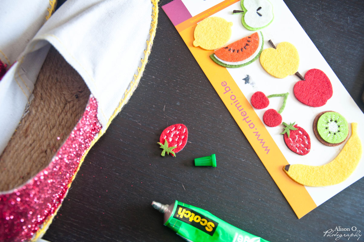 2- Après la session paillettes, il ‘y a plus qu’à coller les petits fruits sur le côté des espadrilles…