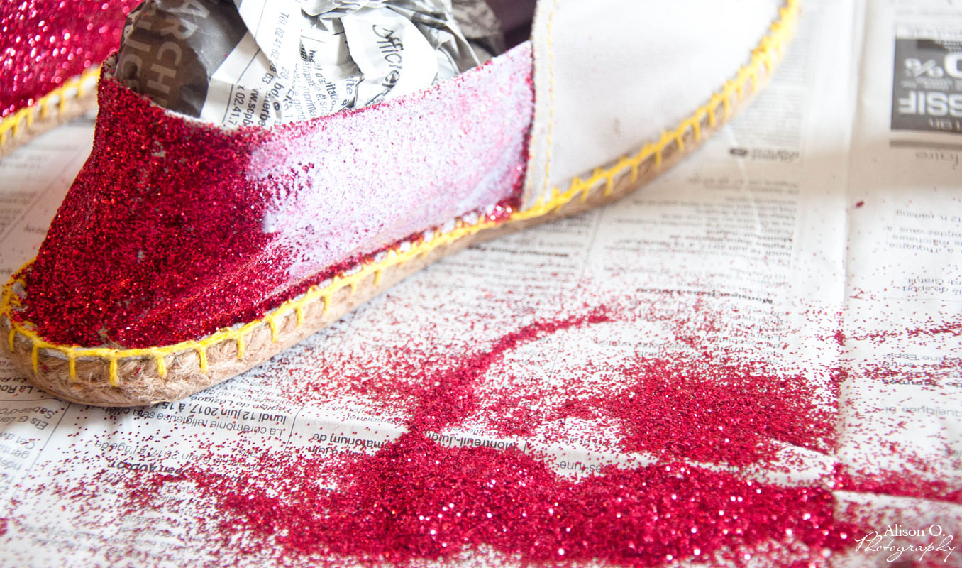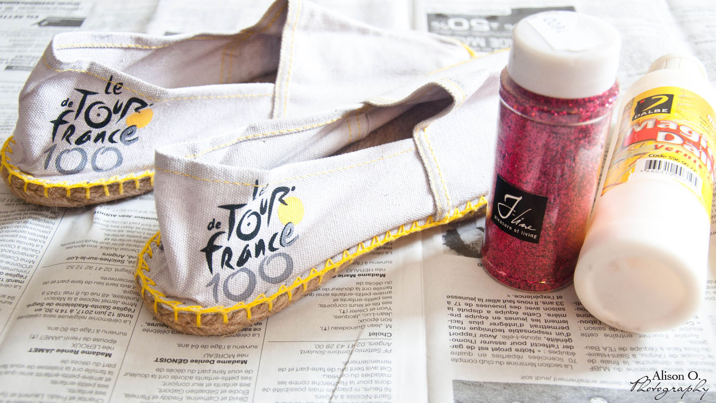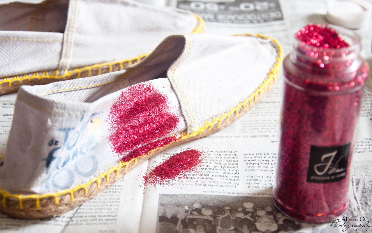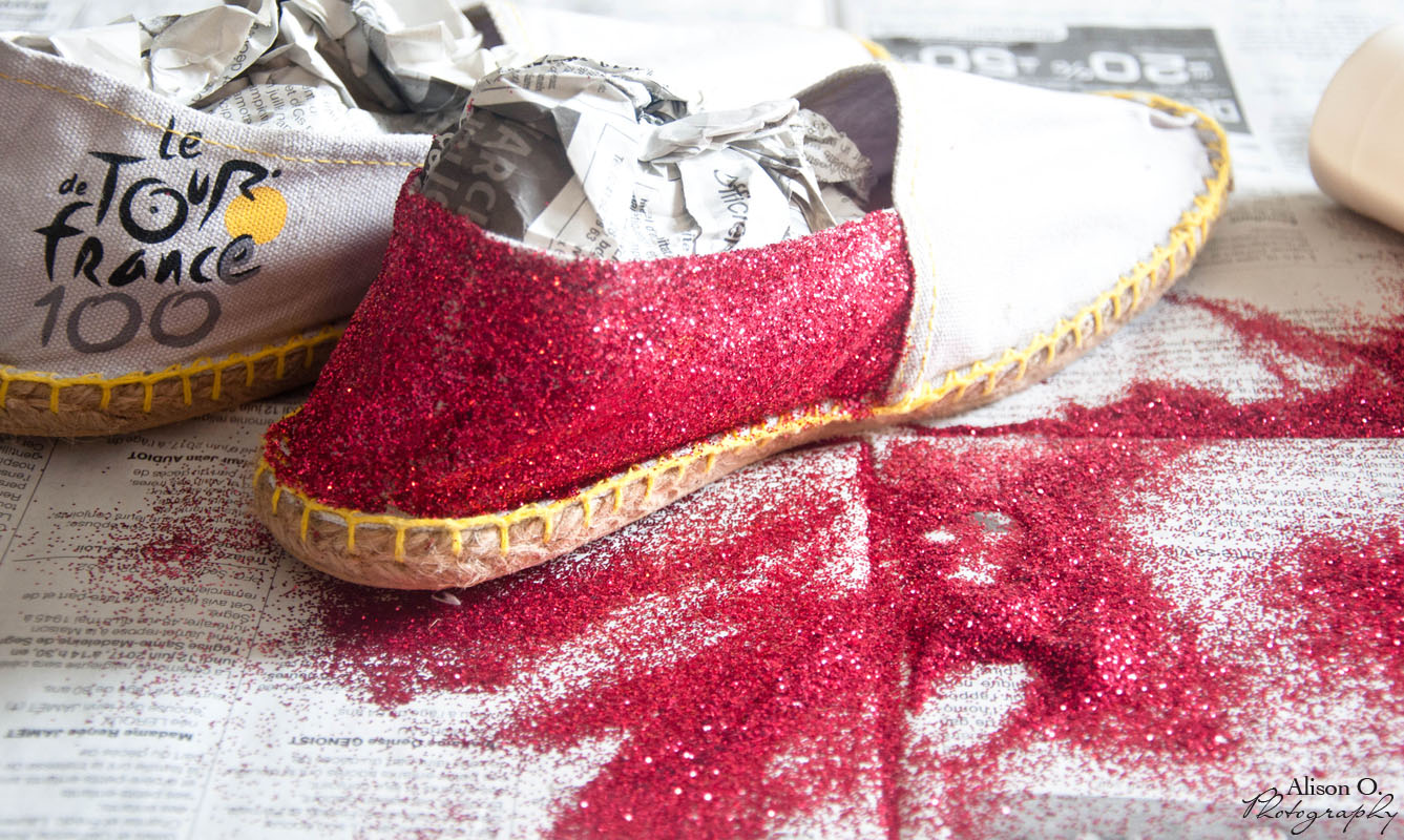 1- J’ai décidé de recouvrir tout le derrière des espadrilles où se trouvait le logo promotionnel du Tour de France ( événement que je déteste au plus haut point en plus…) Du coup, j’ai utilisé la même méthode que lorsque j’avais fait mes ballerines pailletées : Je mets du vernis colle. Je saupoudre de paillettes. Je laisse sécher et je recommence le tout une deuxième fois ! Vous pouvez finir par une dernière couche de vernis colle pour que les paillettes ne se barrent pas tout le temps ^^