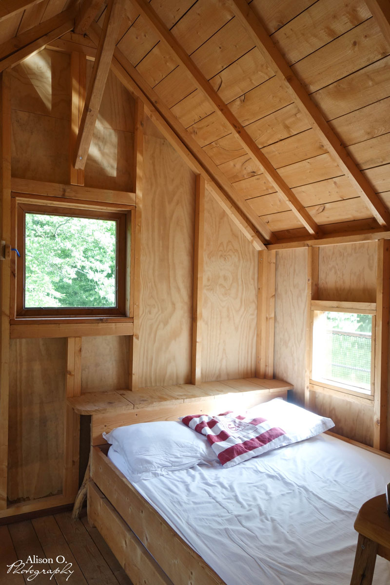 Nous avons déjà fait une nuit en cabane dans les arbres et nous avions souffert de la chaleur. Cette fois-ci il a fait frais. Personnellement, je trouve cela beaucoup plus agréable car emmitouflés dans nos duvets, le froid ne nous a pas du tout gêné. A savoir aussi qu’il n’y a pas de volet, vous vous réveillez donc à la lumière du jour.