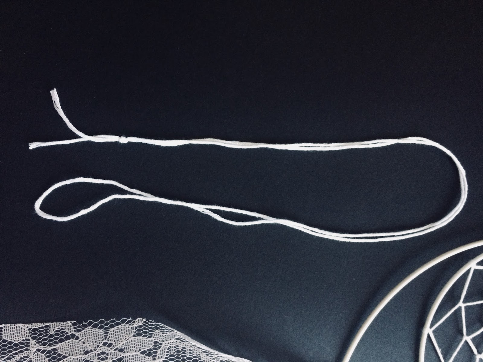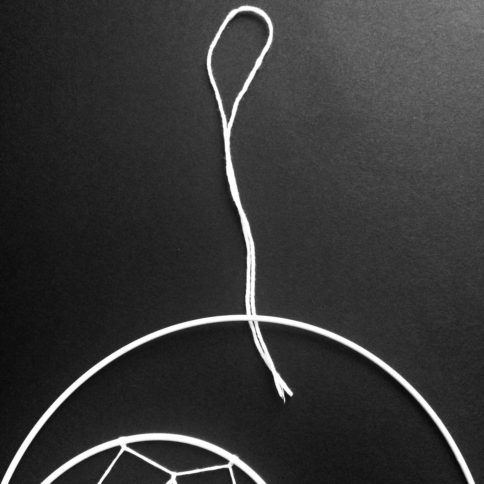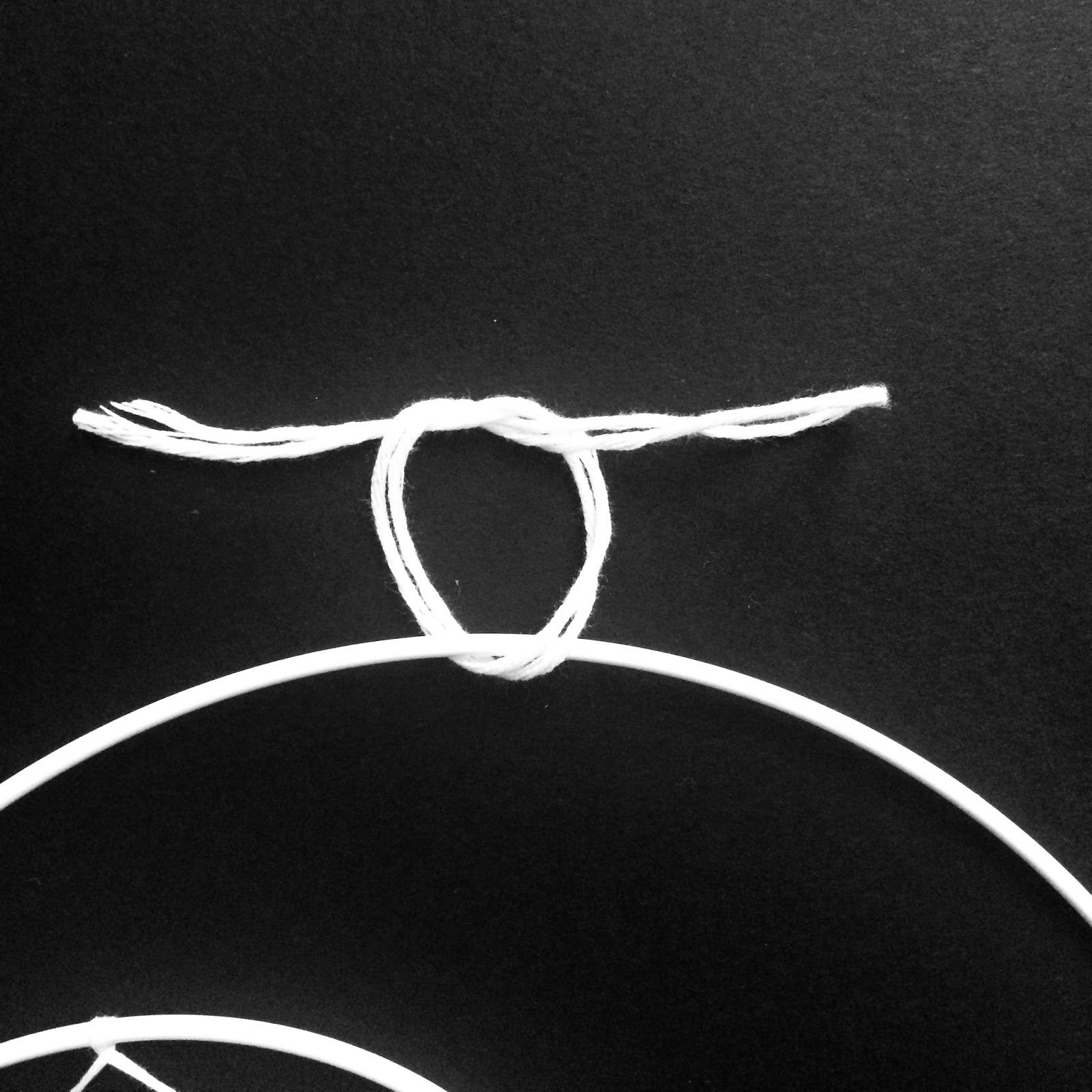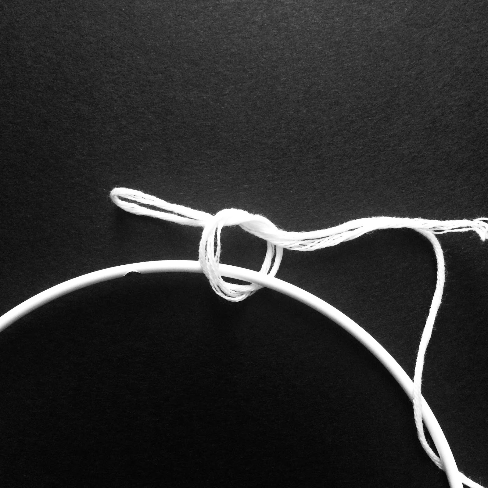 1- On commence par la toile de votre petit cercle. En premier, attachez bien votre fil au cercle par un double nœud.