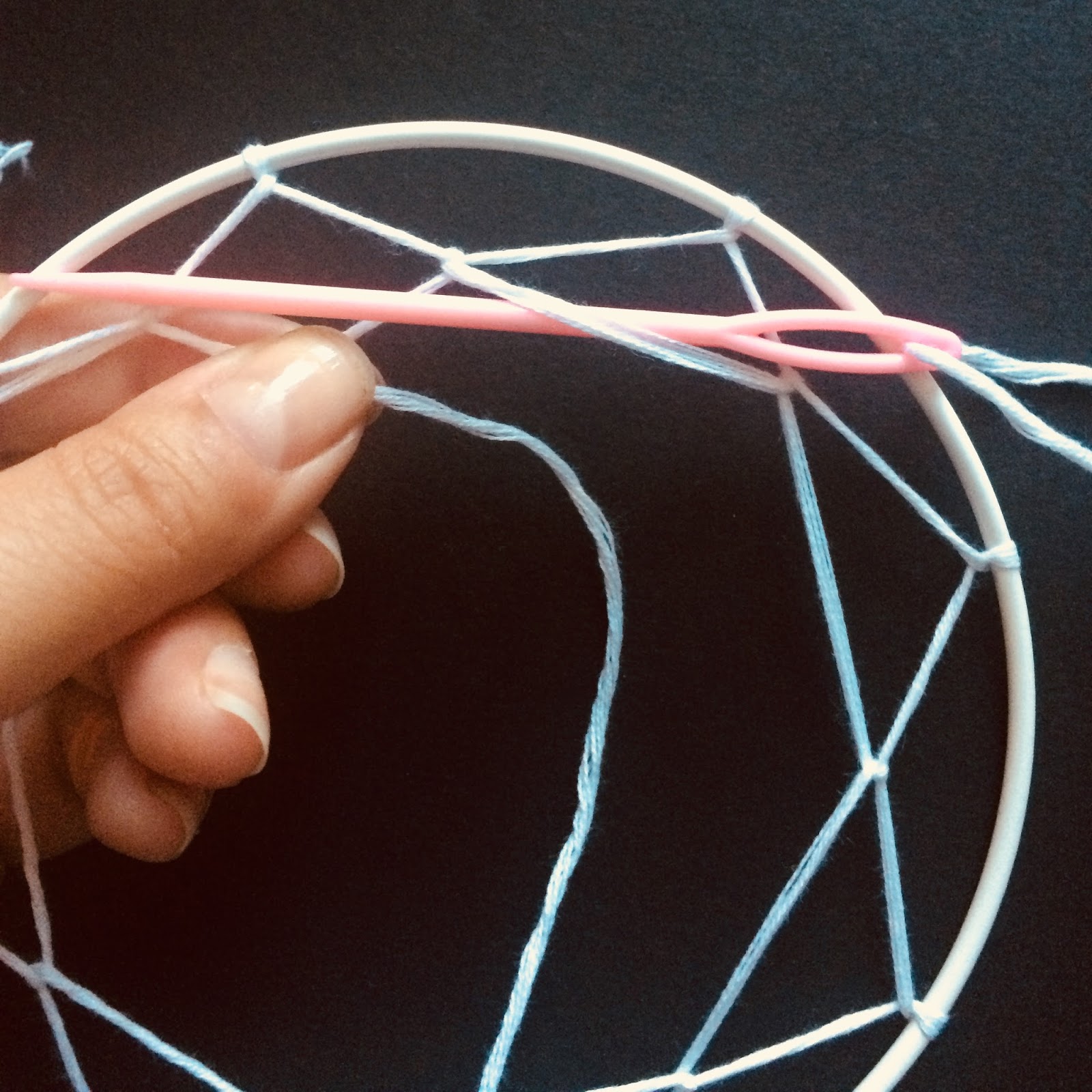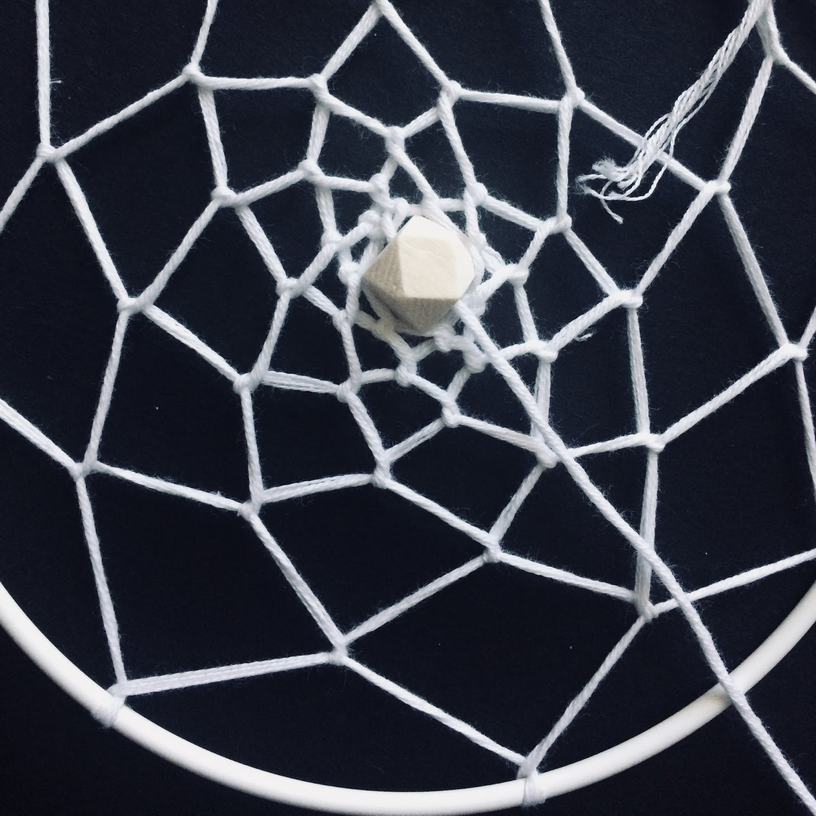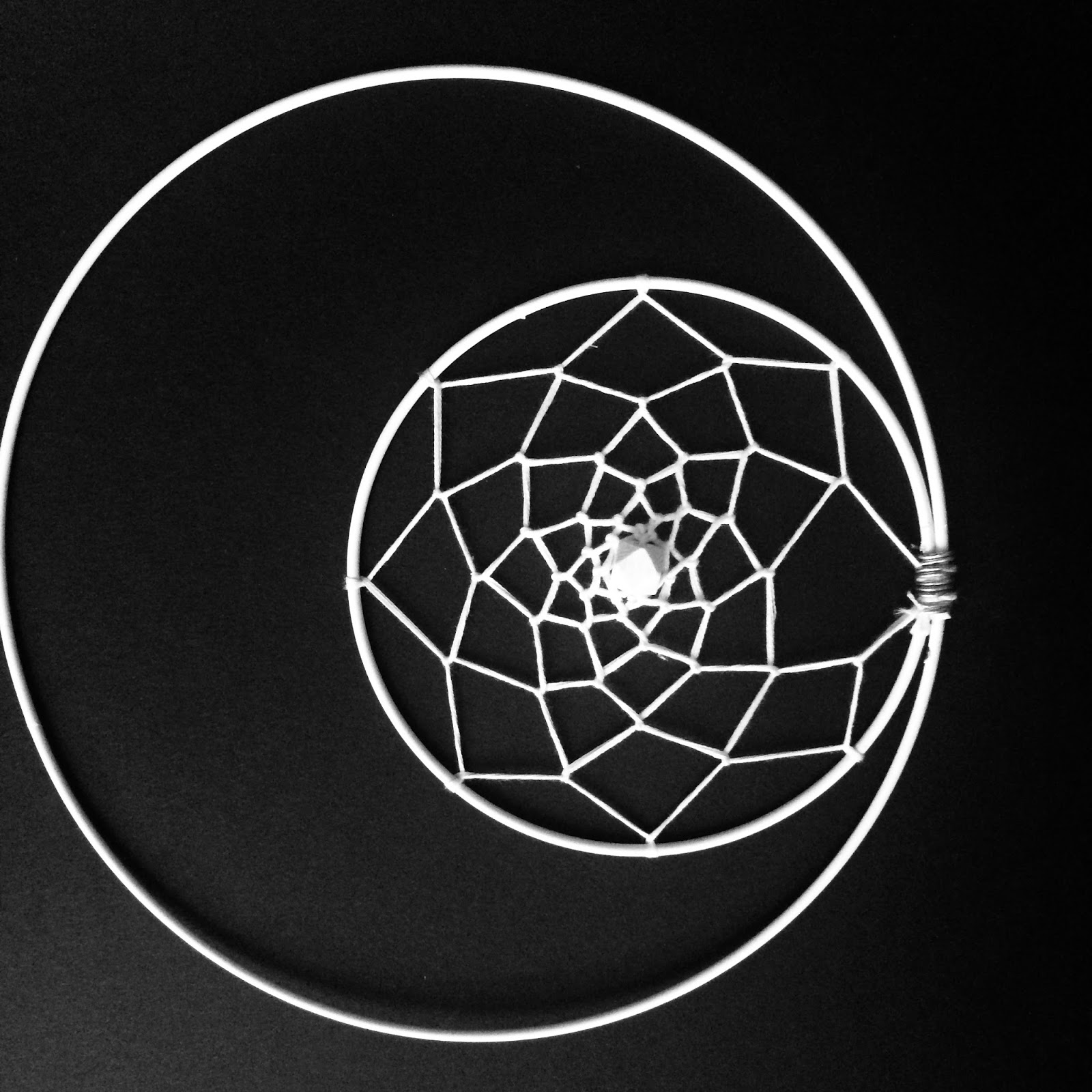4- Une fois que vous avez fait le tour de votre cercle, il faut continuer cette même méthode de “nœuds”, non plus sur votre cercle mais sur vos fils tendus. Il faut essayer de viser le milieu de chacun des fils.