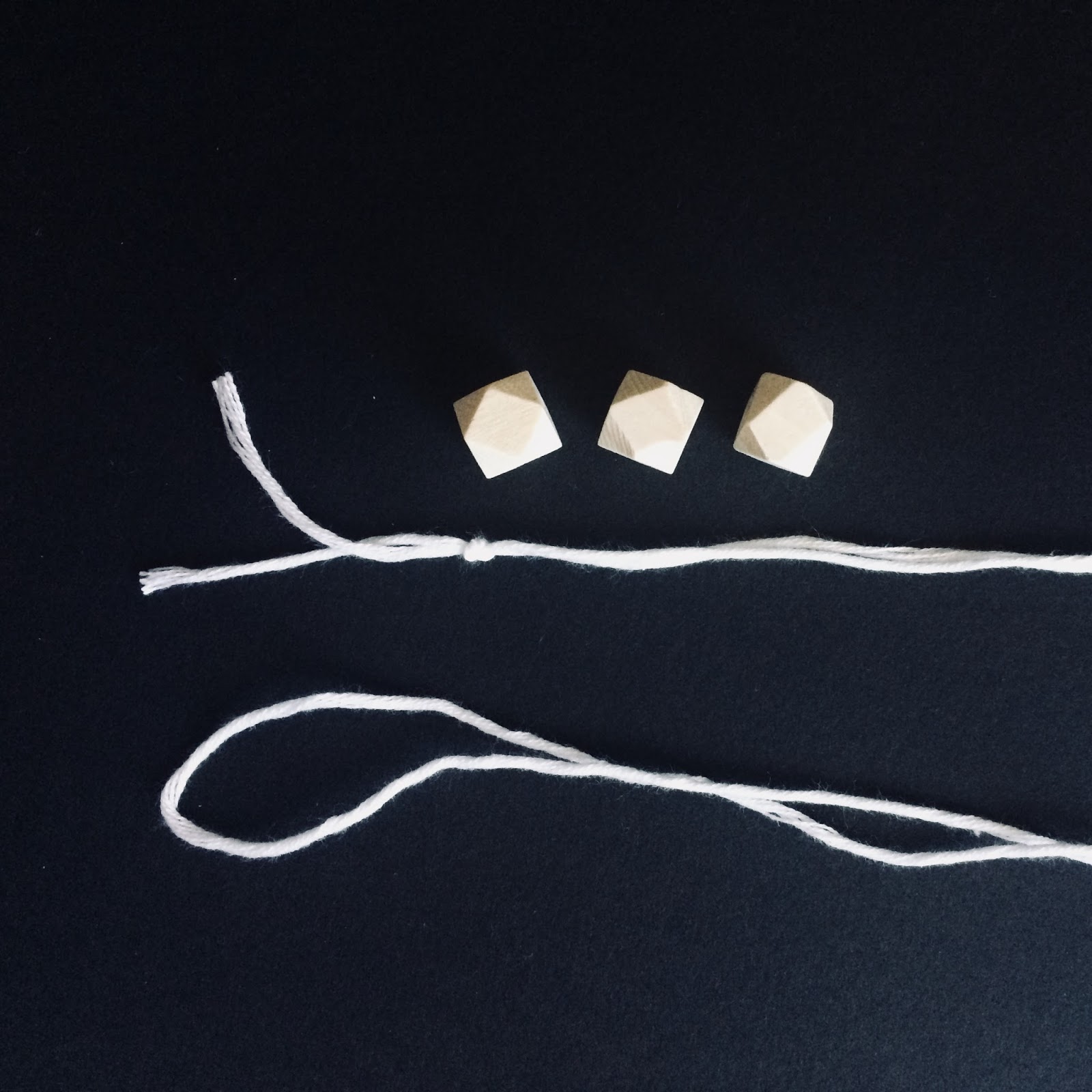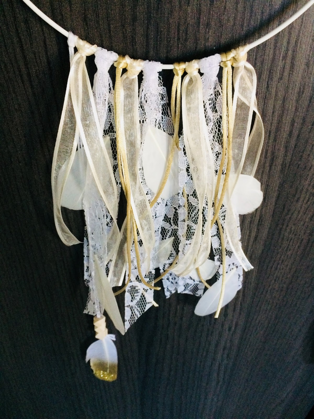 8- J’ai ajouté un grand fil de coton blanc doublé également pour y mettre au bout 3 perles et y enfoncer une grande plume dorée.