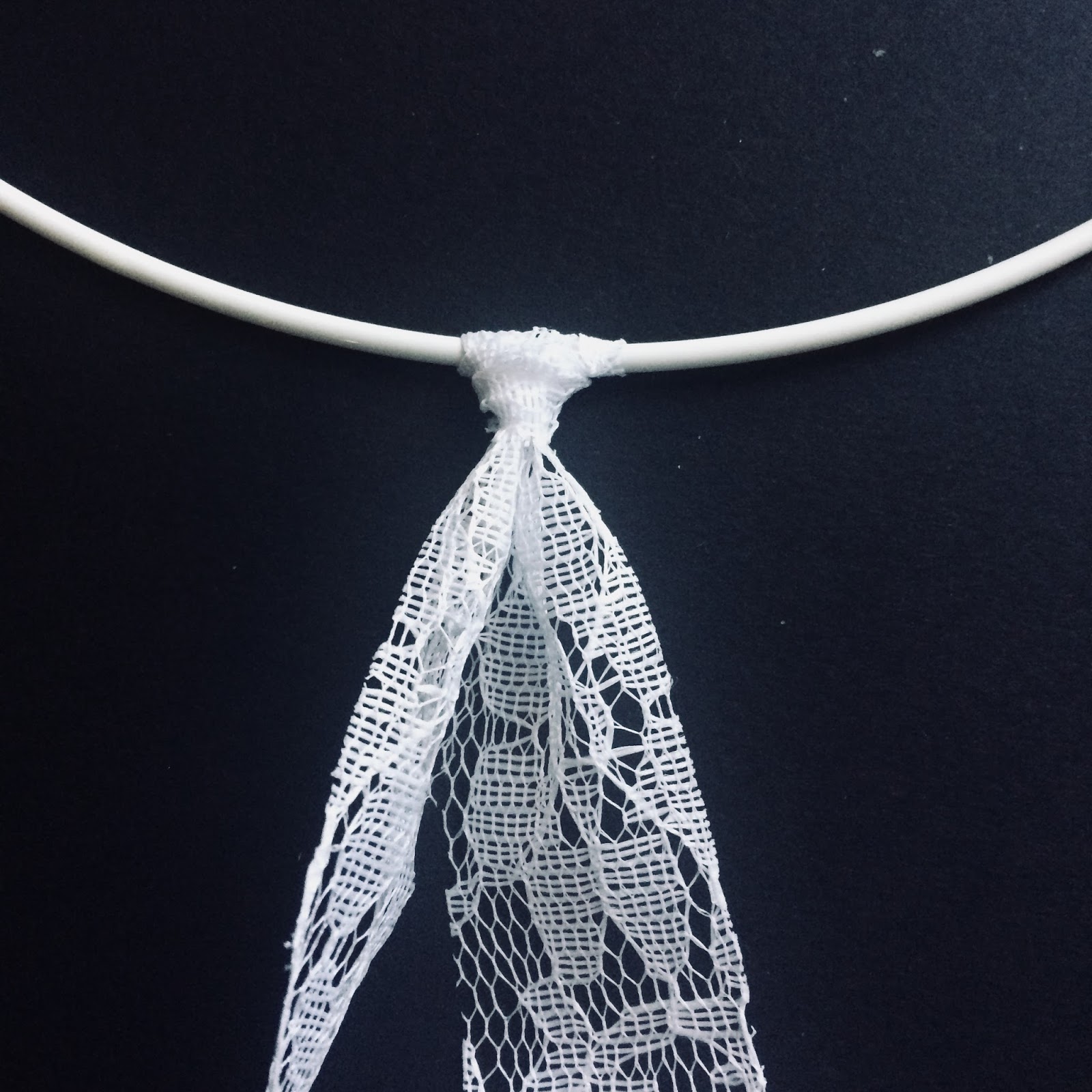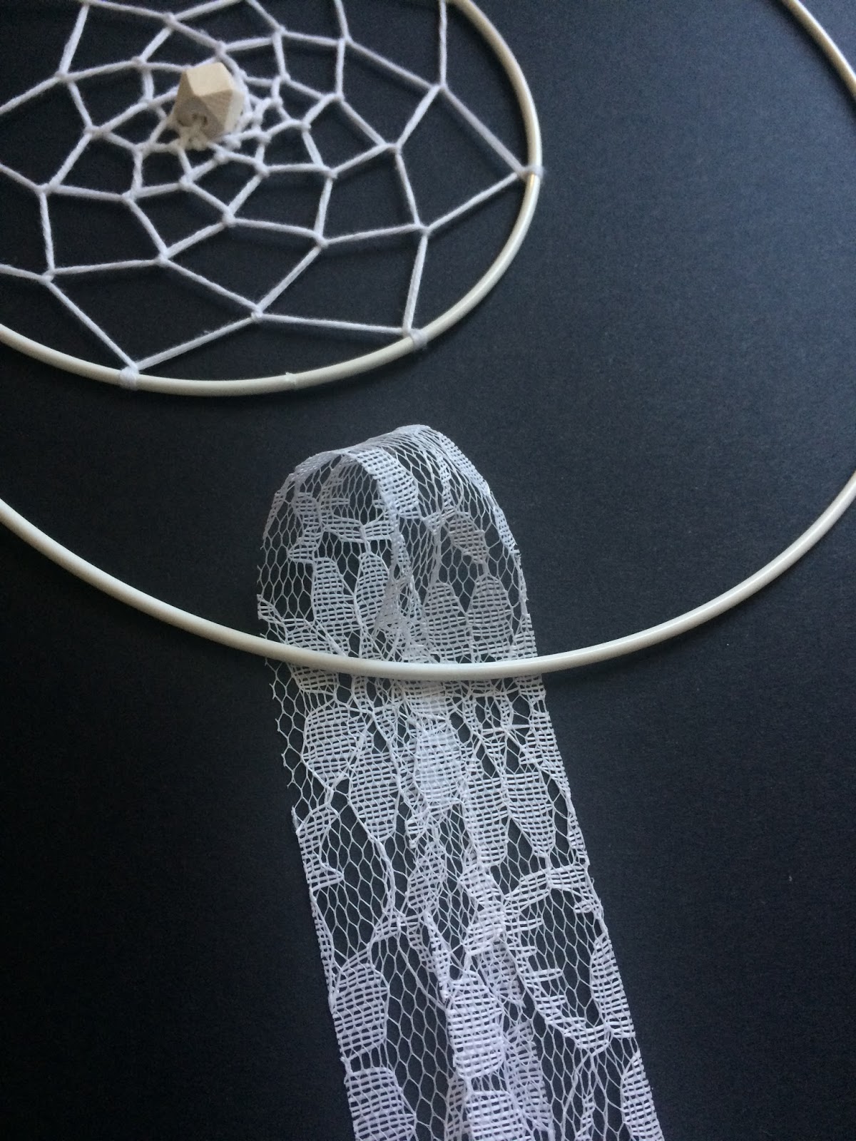7- Vient ensuite la déco ! Là, faites parler votre imagination et vos envies ! Personnellement j’ai alterné dentelle blanche, ruban or et queue de rat dorée. Pensez à doubler votre longueur de ruban pour les attacher facilement à votre grand cercle.