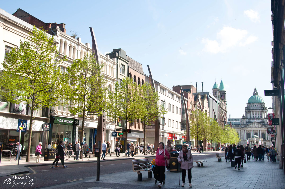 Nous sommes arrivés à Belfast en début d’après-midi. Nous avions peu de temps pour visiter la ville, néanmoins, nous avons pu voir à peu près tout ce que nous voulions avant la fin de la journée 🙂 (En perdant nos pieds au passage…) Nous avons décidé de garer notre voiture près de de notre Airbnb à une vingtaine de minutes du centre-ville de l’autre côté du Lagan. Bref, direction le centre-ville ! Nous avons vu le magnifique Hôtel de ville, puis nous avons fait un tour dans la rue principale Donegall Place.